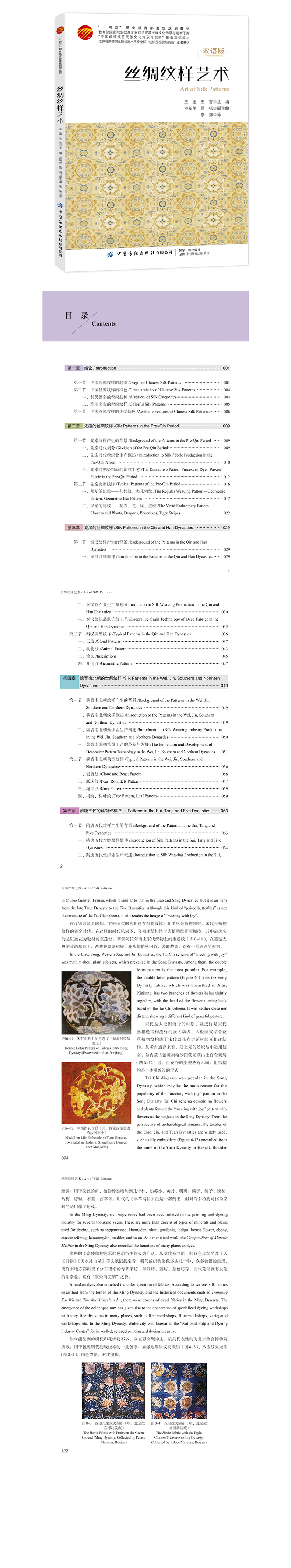 《丝绸纹样艺术》以时间为节点,以纹样为研究核心,对纺织原料、染织工艺、织物品种、社会制度、时代风尚等多方面进行综合性研究。研究时间线从先秦到民国,跨度长、内容广,有一定研究及学术价值。《丝绸纹样艺术》可供纺织品设计、纺织品装饰艺术设计、现代纺织技术等专业的学生使用,也可供纺织面料设计师及相关设计与技术人员参考。